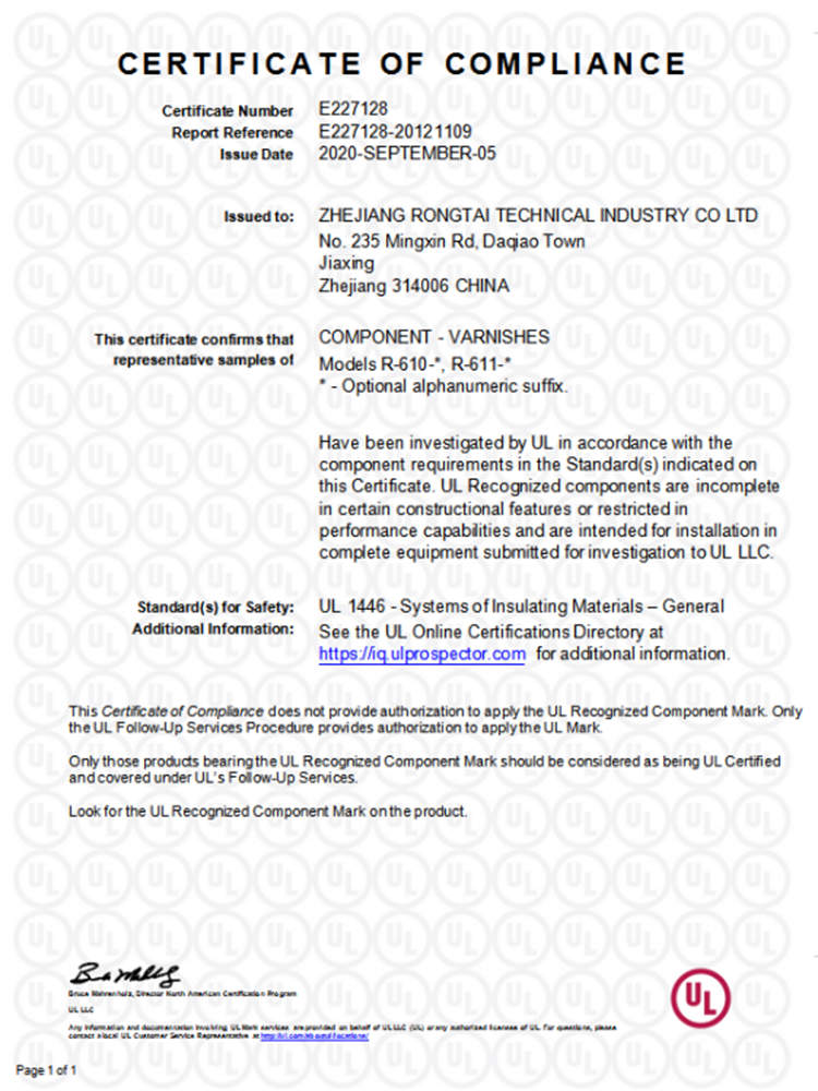 • Zhejiang Rongtai Technical Industry Co.,Ltd. ( Rongtai) is one of the most influential liquid insulation material enterprises in China, established in 1994, with an area of 60,000m2. As a National High-Tech Company, we are certificated by ISO9001, ISO14001, ISO45001 and IATF16959 with CNAS certificated Lab in electrical and electronics industry.